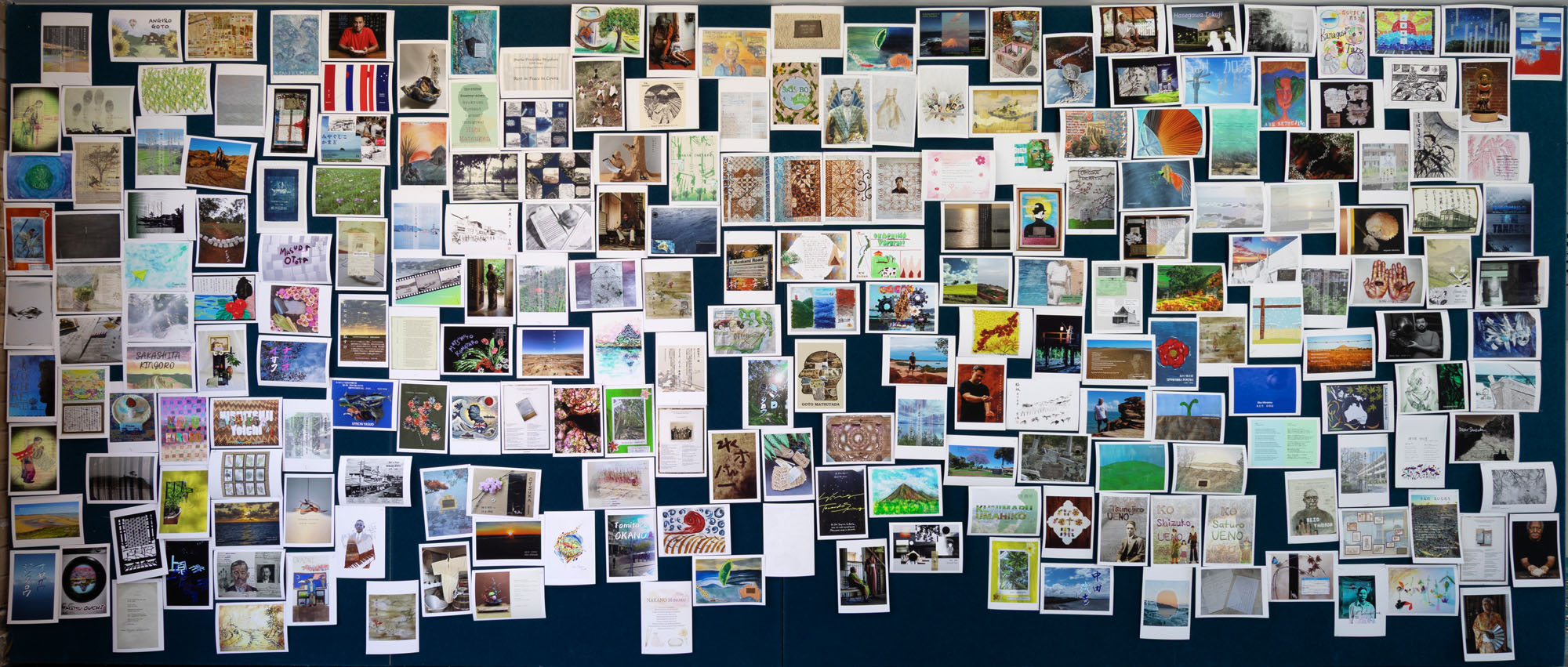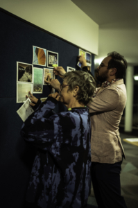 At the launch, the guests gathered in the exhibition room.The artworks were laid out on tables at the front, with a large rectangular board behind them. One by one, each guest took an artwork from the tables and pinned it to the board while listening to an audio artwork reciting the names of all the internees. This ritual echoed the Japanese Buddhist incense ceremony of oshōkō, in which guests offer incense to the deceased while listening to sutra chanting by a priest. In this way, the artworks were hung one by one to form a communal collage.